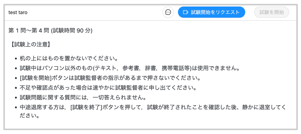 2.試験に関する注意書きがブラウザ画面に表示されますので、注意事項の確認が完了したら、「試験開始をリクエスト」をクリックします。