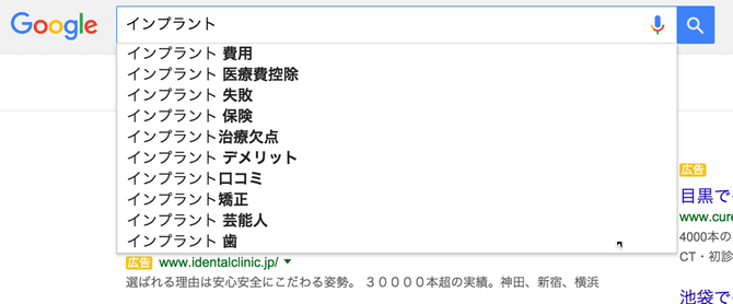 キーワードサジェストとも呼ばれ、ユーザーがより短時間で探している情報を見つけやすいように補助するものです。通常上の方から順番に検索数が多いものが表示されるようになっています。