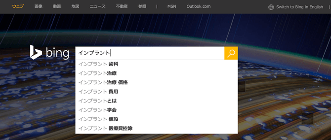 ヤフージャパンはGoogleの検索データを使っていますが、ヤフージャパン上で検索されるキーワードは独自に集計しておりヤフージャパン独自のものが表示されます。また、ヤフージャパンやGoogleとは提携関係が無く、独自で検索エンジンを運営しているマイクロソフト社のBingにはBing独自のキーワード予測データが表示されます。