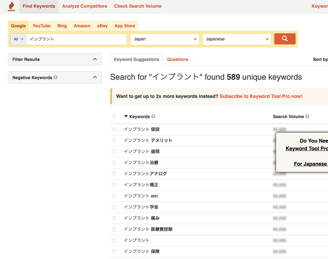 検索ユーザーが検索している複合キーワードが表示されるキーワード予測データはSEO担当者にとって非常に便利なツールですが、表示されるデータをコピーすることは出来ず、またたくさんのパターンを一気に表示することはこれら検索エンジン上では出来ません。
