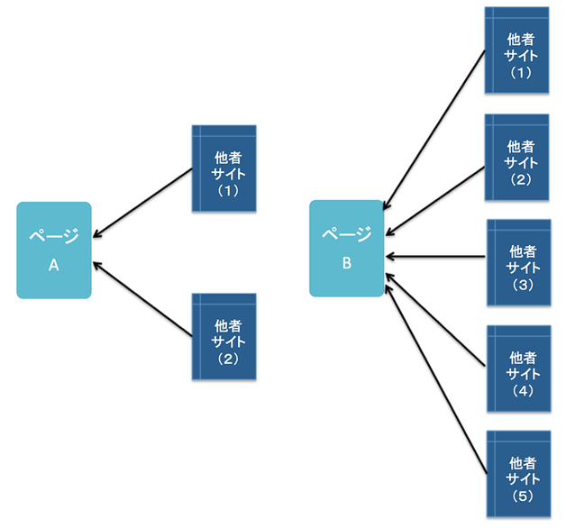 一方、右にあるページBは5つの外部ドメインのサイトからリンクが張られています。