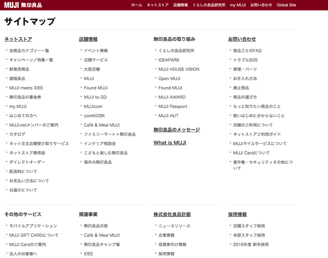 そしてサイトマップページ自体が見つからないのでは話にならないのでほとんどのWebサイトは全てのページのヘッダーか、フッターのメニューから下図のようにサイトマップページにリンクを張り、迷子になったユーザーに見てもらえるように配慮しています。