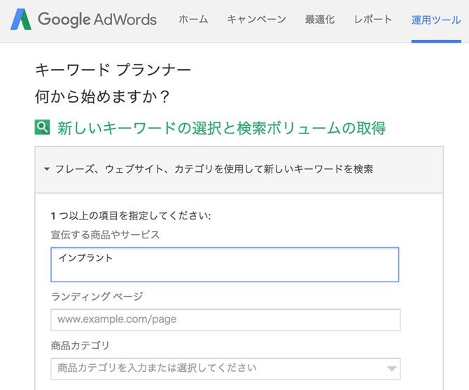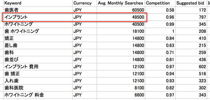 例えば前ページの図のようにGoogleキーワードプランナーに「インプラント」というキーワードを入れて検索すると