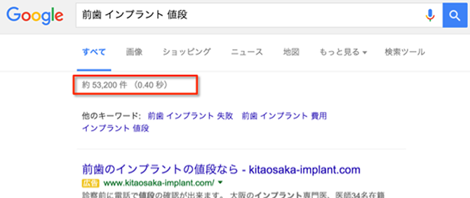 例えば、サイトのトップページを「インプラント」で上位表示させることは短期間では実現できないので、インプラントというキーワードの関連キーワードをGoogleキーワードプランナーで調べて「前歯 インプラント 値段」等のような比較的上位表示しやすいスモールキーワードでの上位表示を初期の目標にします。