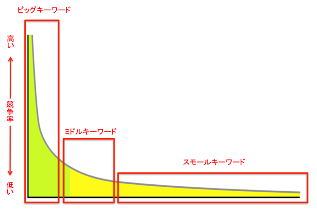 SEOにこの理論を応用すると、「競争率の激しいビッグキーワードでの上位表示ばかりを追いかけなくても、競争率の低いスモールキーワードをたくさん目標化して上位表示を達成すれば、労少なく効率的に見込み客が自社サイトを見に来てくれる」というものです。