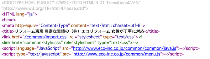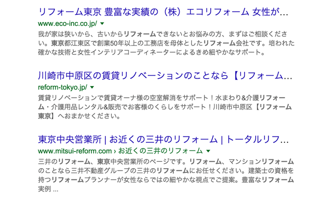 このページは「リフォーム 東京」という検索キーワードで上位表示を目指しているページなのでそれらのキーワードをなるべく目立つように記述し、かつユーザーが見た時にそのページがあるサイトの特徴を瞬時に良い印象とともに認識することを目指している例です。