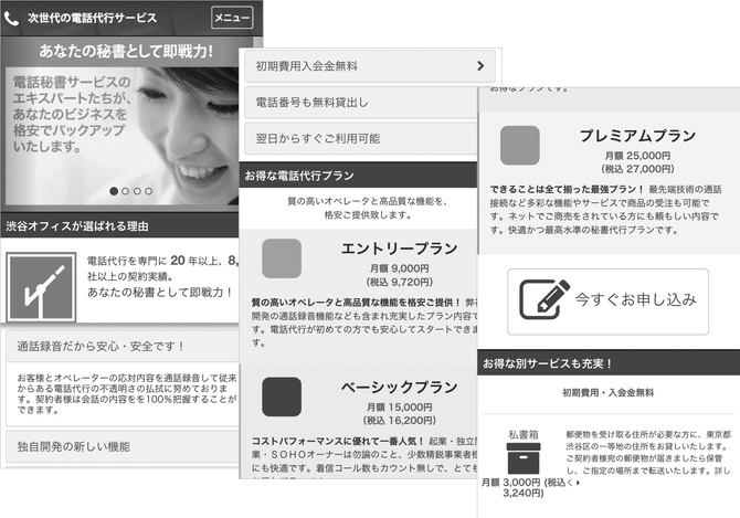 次の図は電話代行サービスを専門として提供している会社のモバイル対応サイトのトップページです。
