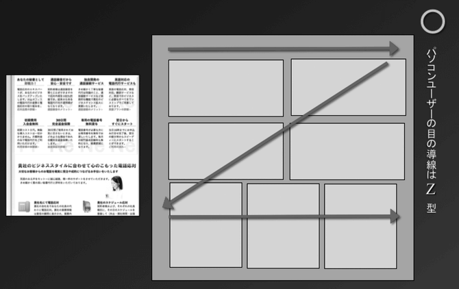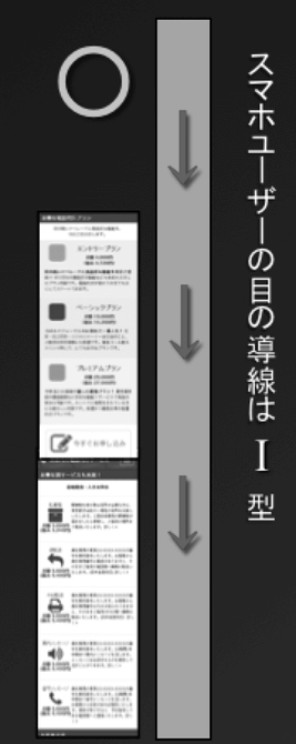 PCサイトは画面の幅が広いのでユーザーの目の動線は左から右、右から左下へという「Z型目線」ですが、スマートフォンの画面は幅が狭く、縦が長いので上から下へという「I型目線」です。