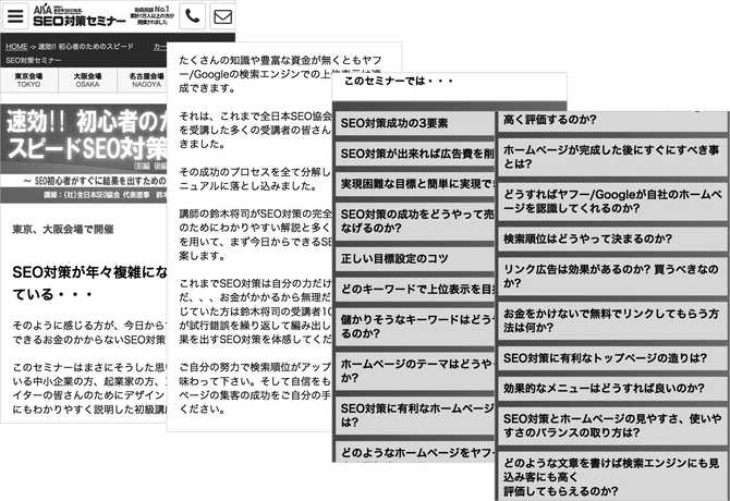 複数のセミナーや講座の詳細ページへのリンクと提供者の簡単な自己紹介だけを載せるようにしています。この場合のトップページの役割は各商材の全体像を知ってもらうことではなく、ユーザーが興味をもった商材の詳細ページに誘導するための選択肢を提供する事です。
