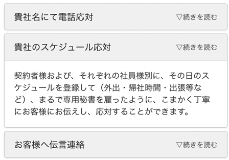 下の図は実際にアコーディオンのソースを用いたスマートフォン対応サイトの例です。矢印のある行をタップするとその下にその項目の詳細が表示されます。