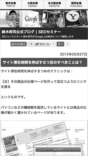 商品を紹介するページの場合は、商品を目立つようにするためにページの上にはソーシャルボタンを置かずに商品の紹介が終わった部分に置くと商品情報を邪魔することを避けられます。