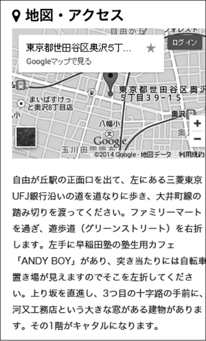 Googleマップを表示することが主流になっていますが、GoogleマップのAPIを使ってモバイルユーザーが居る位置情報を割り出しそこからの道順を表示したり、複数の実店舗がある場合は地図上にそれら複数のお店のアイコンが表示されるなどの工夫も来店率アップに寄与します。