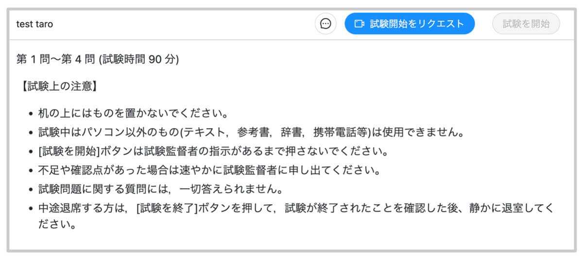 2.試験に関する注意書きがブラウザ画面に表示されますので、注意事項の確認が完了したら、「試験開始をリクエスト」をクリックします。
