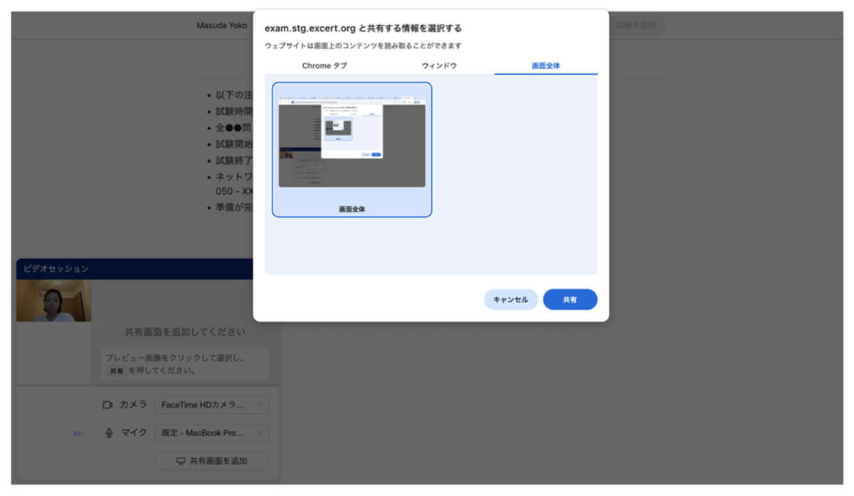 3.PCのインカメラが自動的に起動しますので、左側の小窓に自分の顔が映っていることを確認します。また、画面共有のボックス内にある自分のPC画面の映像をクリックして、青くなった「共有」ボタンを押します。