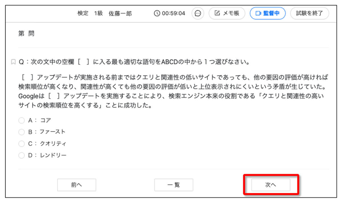 5.試験がスタートしたら4択(ABCD)の中から正しい答えを選択して、「次へ」を押して次の問題に進んで下さい。(「前へ」を押すと前のページに戻れます)