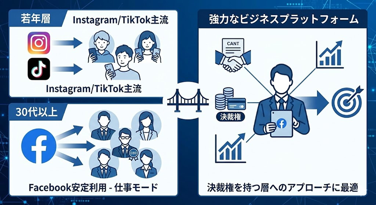 日本国内を見ると、確かに若年層ではInstagramやTikTokが主流になりつつありますが、30代以上の層ではFacebookが安定して使われ続けています。特にビジネスパーソンや経営者の間では、今でも「仕事モードのSNS」としてFacebookを利用するケースが多いのが特徴です。