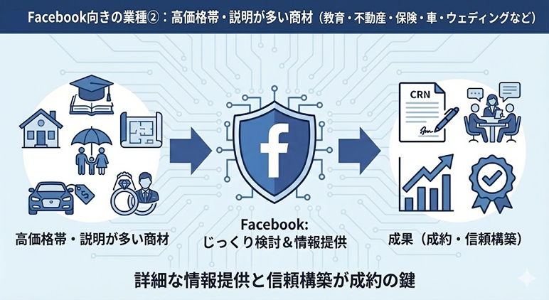 Facebookと非常に相性の良いもう一つの領域が、「高価格帯」かつ「じっくり検討される」商材を扱う業界です。学習塾、不動産、住宅、生命保険、投資信託、自動車販売、ブライダルなどが代表例です。