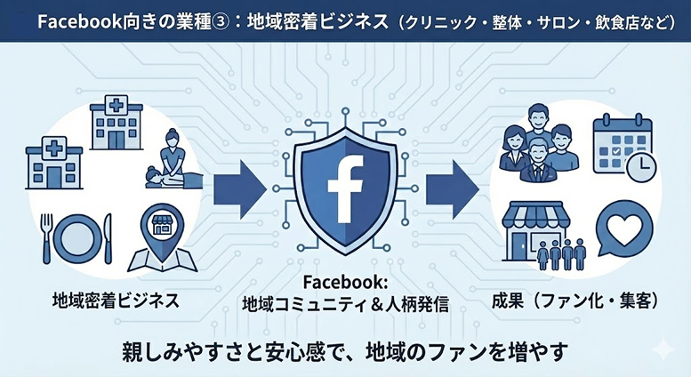 三つ目が、地域密着型のビジネスです。クリニック、整体院、鍼灸院、エステサロン、美容室、カフェ、地域イベントの主催団体などが当てはまります。こうした業種では、「どこに行くか」よりも「誰に診てもらうか」「どんな人がやっているのか」が重要視されます。Facebookは人柄が伝わる投稿との相性が非常に良く、院長やスタッフの日常、現場の雰囲気、患者さんとのやり取りなど、安心感につながる要素が自然に伝わります。