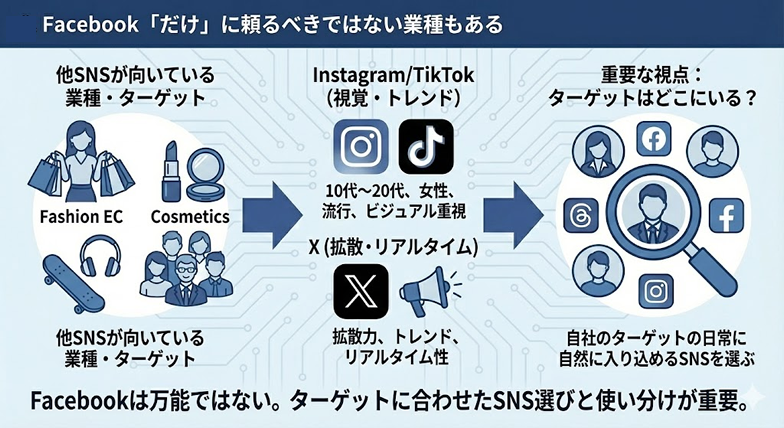 ここまでFacebookの強みをお伝えしてきましたが、すべての業種にとって万能なSNSというわけではありません。中には、FacebookよりもInstagramやTikTok、Xを中心に据えた方が成果が出やすい業種も存在します。