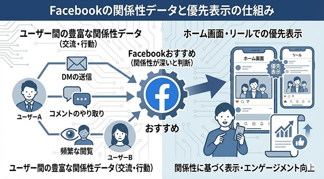 そしてFacebookの特長は、ユーザー同士の関係性データが豊富にあることです。たとえば、過去にDMを送った相手、コメントをやり取りした相手、あるいは頻繁に投稿を見ているアカウントなどは「関係性が深い」とみなされ、ホーム画面やリールで優先的に出てくるようになります。