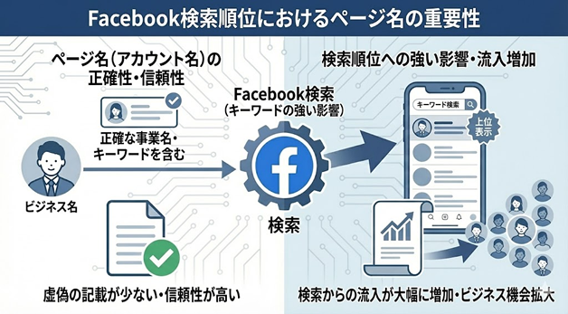 私はコンサル現場で、Facebookのページ名にキーワードを入れていなかっただけで「検索からの露出がゼロだった」企業をいくつも見てきました。