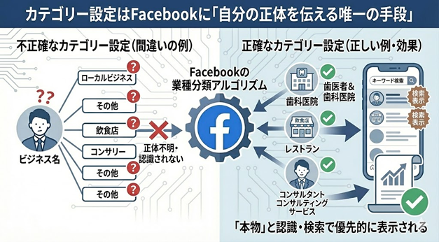 というように、Facebook側は業種を分類するアルゴリズムを持っています。正確なカテゴリーを設定することで、Facebookはそのページを「本物の歯医者」「実在の美容室」などと認識し、検索にも優先的に表示しやすくなります。