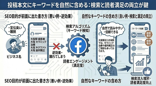 しかし、ここで重要なのは過度なキーワード詰め込みをしないことです。「歯医者 歯医者 歯医者」「難波 難波 難波」などの不自然な記述は逆に評価を落とします。Googleと同様、自然言語で書かれたテキストが最も高い評価を得ます。私の経験上、「ユーザーにとって読みやすい文章になっているか」を常に基準にすることがFacebook内SEOでは正攻法として機能します。