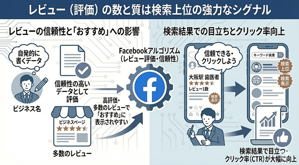 Facebook検索結果にはレビュー評価が表示されるため、上位表示された際のクリック率(CTR)が大きく上がります。