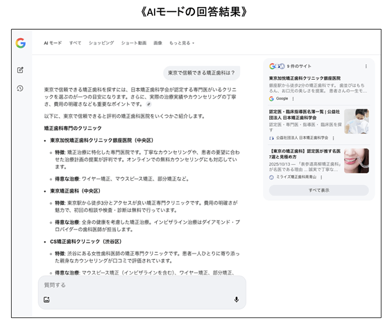 そのため、ユーザーの関心は「どのサイトが上か」ではなく、「AIがどの企業を推薦するか」に移りつつあります。たとえば「東京で信頼できる矯正歯科は?」と聞かれたAIが、あなたの医院名を挙げることができるかどうか。それが今後の集客力を左右します。