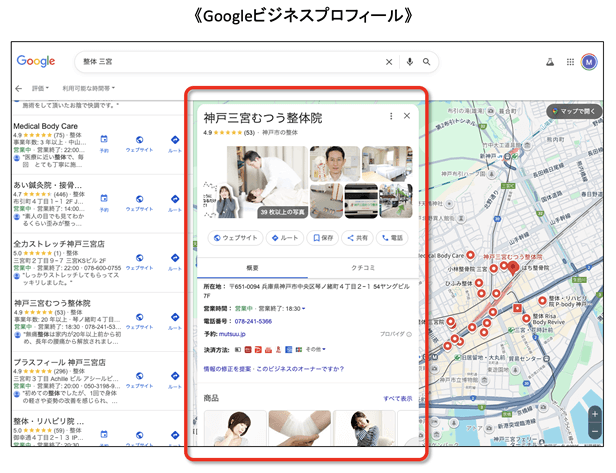 2. Googleビジネスプロフィール(MEO):営業時間、住所、口コミ評価、写真などの信頼データ。