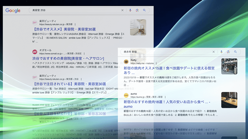 近年、Googleで検索すると比較サイトや、口コミサイト、ランキングサイトが上位表示していることが増えてきています。これらのサイトはGoogleの検索結果上で例えば、「美容室 渋谷」で検索すると「【渋谷で注目されている】美容院・美容室30選」だとか、「東京都渋谷のヘアサロン・美容室30選 」と表示され、「焼き肉 新宿」で検索すると「新宿で人気の焼肉 ランキングTOP20」、「新宿の焼肉オススメ15選!食べ放題やデートに使える個室あり」などと表示されるものです。