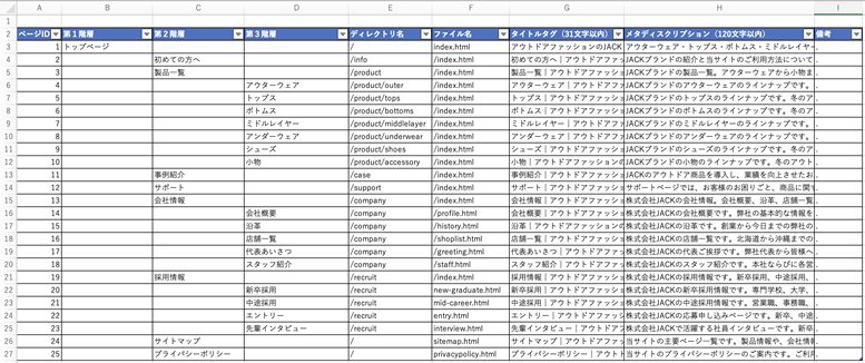 リストアップしたページをどのような階層で配置するかを決めます。トップページが第1階層にあり、その下に主要なカテゴリページ、第3階層に詳細ページが続く形で整理すると、ユーザーが目的のページにたどり着きやすくなります。