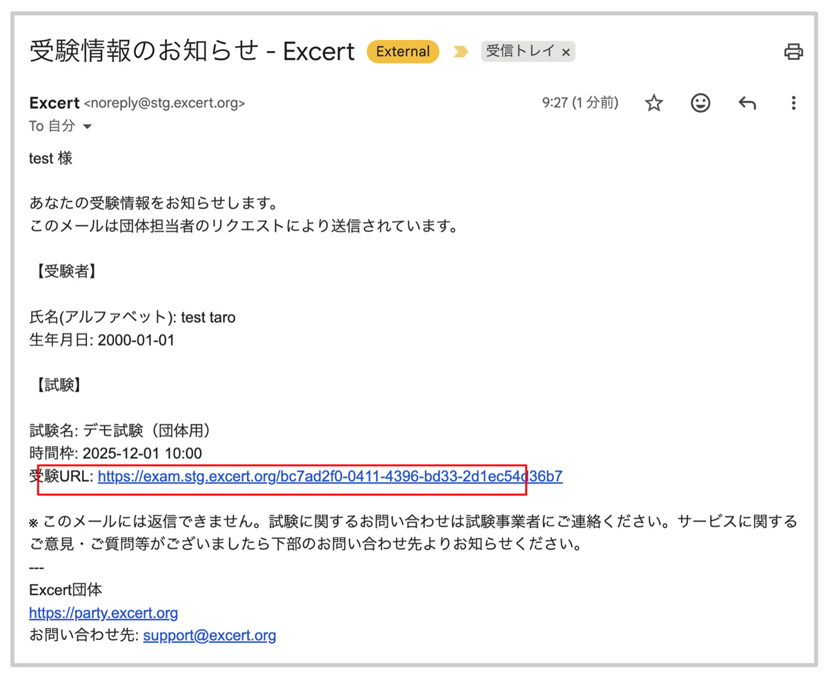 1.試験の申込みをした後に自動送信された以下のメールをご覧下さい。そのメールに記載されている「受験URL」という欄にあるURL(アドレス)をクリックして下さい。