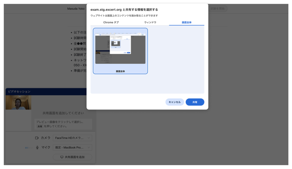 4.左側の小窓の上側に自分の顔の映像、下側に自分のPC画面が映し出されている状態になれば準備は完了です。このままの状態で試験官が入ってくるのを待ちます。