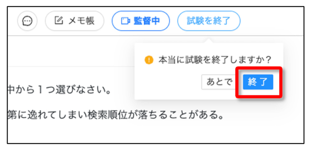 6.全ての問題の回答が終了したら、右上の「試験を終了」をクリックしてください。さらにポップアップが出るので「終了」をクリックすると試験が終了します。 一度「試験を終了」をクリックすると試験は終了するため試験の再開はできませんのでご注意下さい。