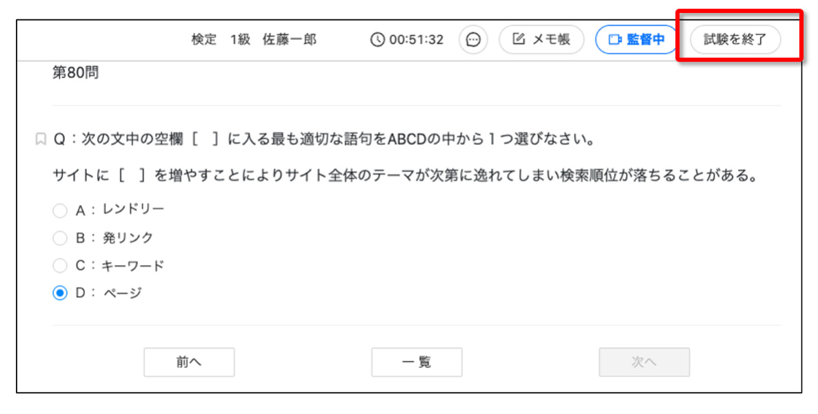 ・ 試験を途中で誤って終了、ブラウザを閉じる、電源が切れるなどで切断した場合はその時点で試験終了となり、再受験・再開はできません。