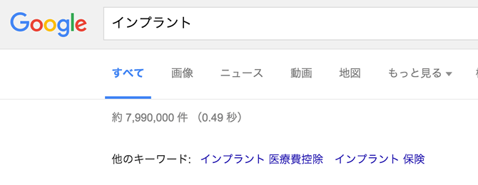 下の図はGoogleで「インプラント」というシングルキーワードで検索した時の検索結果画面です。