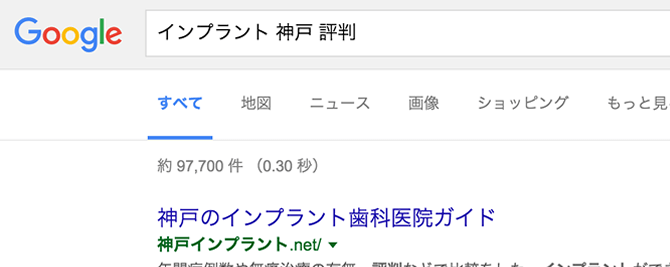 さらに、その後に評判というシングルキーワードを追加して「インプラント神戸 評判」という3つのシングルキーワードから成る複合キーワードで検索すると該当ページ数はわずか約 97,700 件のページ数にまで減少します。