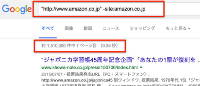 次の図はhttp://www.amazon.co.jpにリンクを張っているhttp://www.amazon.co.jpの被リンク元の検索結果ページです。画面左上の数字の部分の「約1,510,000件」という数値がおおよそのこのページへリンクを張っている被リンク元ページ数です。