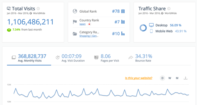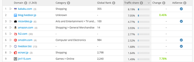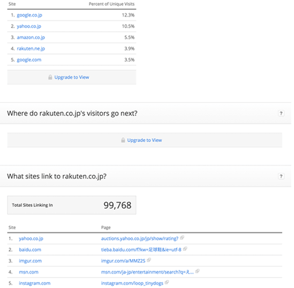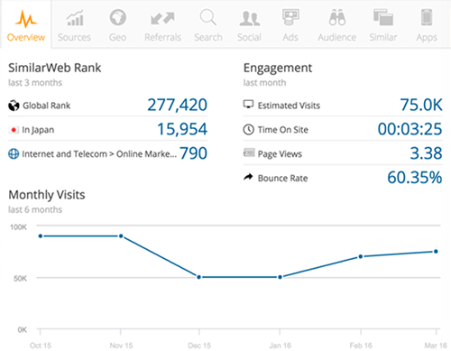 しかし、アクセス数が少ないサイトはシミラーウェブ以上にデータを見ることがきないという短所があるため競合調査をするというよりは各業界のトラフィックが多いサイトのアクセスランキングを知ること以上のことはほとんど出来ません。
