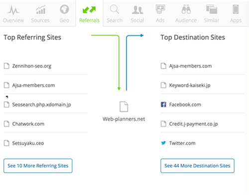 競合他社のサイトへの流入キーワードの他にも、どこのサイトから競合のサイトにユーザーが流入したかという流入元のデータがわかります。