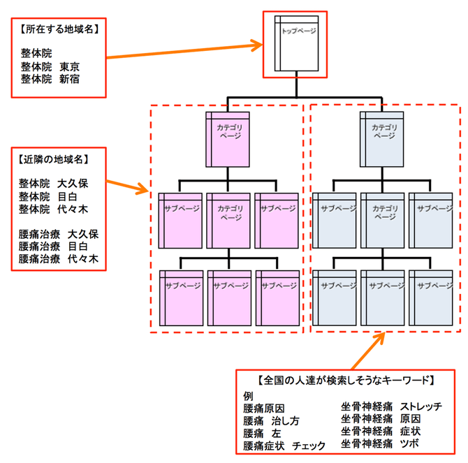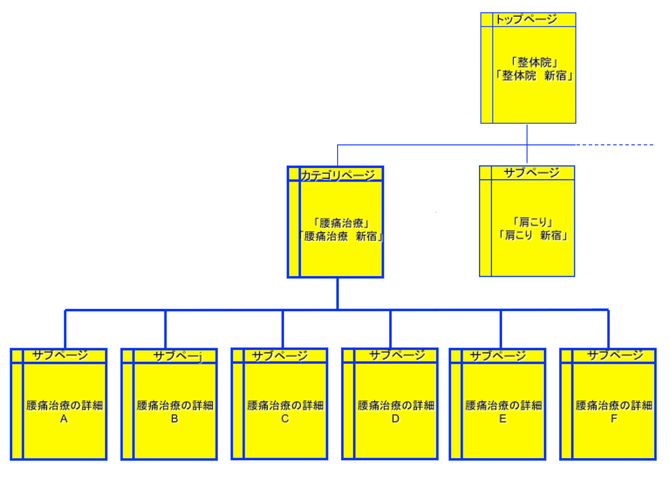 しかし、1ページだけ作ったとしてもどんなに文字や画像などのコンテンツが多くても競争が激しいキーワードならば上位表示は困難になります。その場合は、複数の腰痛治療に関するページをサイト内に増やして腰痛治療のサブページをまとめるカテゴリページを作るのです。そしてそこから腰痛治療のサブページにリンクを張ればそのカテゴリページが「腰痛治療」や「腰痛治療 新宿」で上位表示されやすくなります。