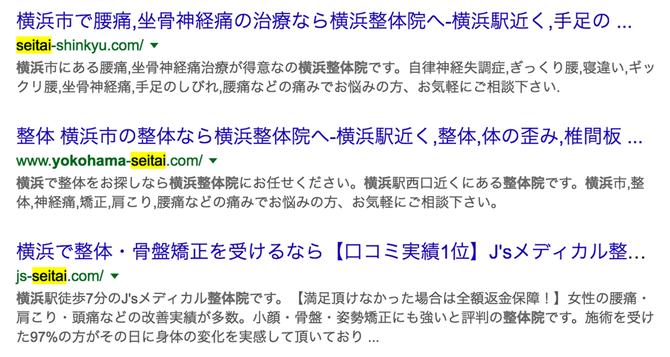 こうしてトップページは整体院が所在する地域名を含む複合キーワードで上位表示を目指し、それ以外のサブページでは近隣の地域名を含む複合キーワードでの上位表示を目指して行きます。