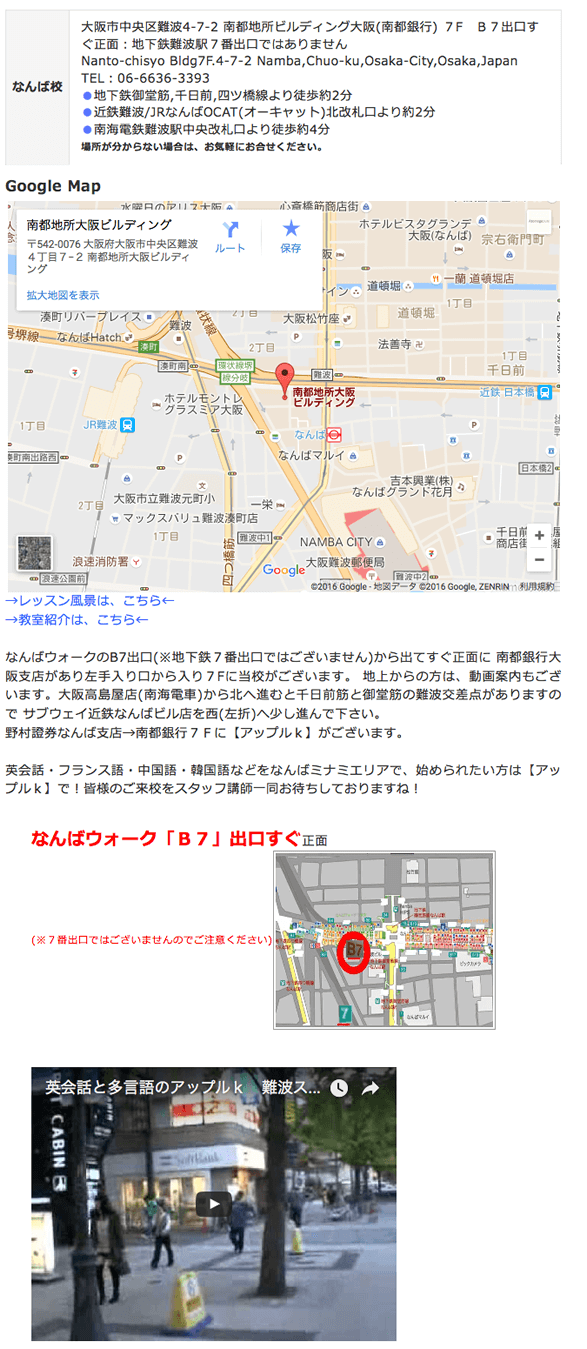 アクセスページを徹底して作りこんでいるページには駅や主要幹線道路からの道順を途中の建物や風景の写真も掲載しています。また最近では動画で撮影してYouTubeにアップしてページに貼り付けているところもあります。