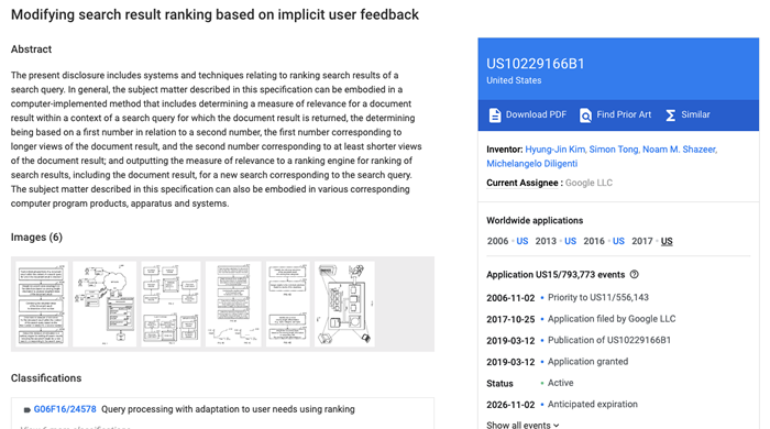 【参考特許】US10229166B1「暗黙のユーザーフィードバックに基づいた検索ランキングの修正」