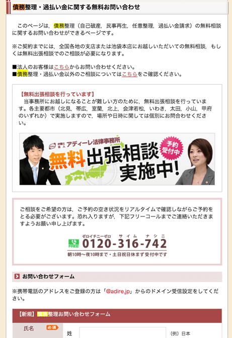 次の例は実際に「債務整理」というビッグキーワードでGoogleで検索すると1ページ目に表示されているサイトにあるお問合せフォームのページです。そこには約500文字の文章やフレーズがフォーム記入欄の上に書かれています。