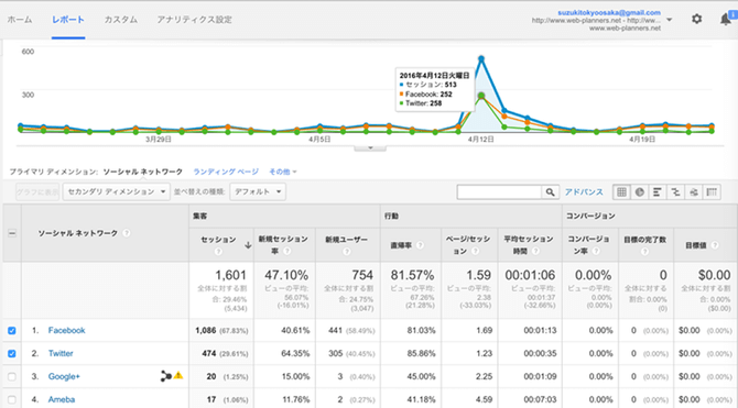 一方、Googleアナリティクスの「Social:ソーシャル」のほうは、自社が取り組んでいるソーシャルメディア活用がどのくらいの成果を上げているかを確認することが出来ます。