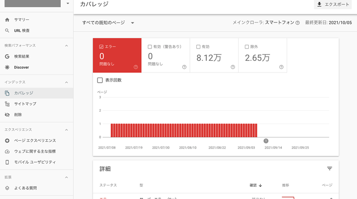 サーチコンソールで最も基本的な情報としては「カバレッジ:インデックス状況」という項目があります。