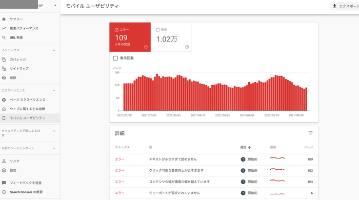 近年重要性を増しているスマートフォン版サイトが、スマートフォンを使うユーザーに使いやすくなっているかを調べる画面があります。「モバイルユーザビリティー」という項目でそれを見ることが出来ます。