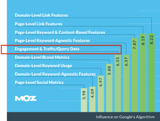 この事は毎年のように海外の有力なSEO会社が発表しているSearch Engine Ranking Factors(検索順位決定要因)を見ると下図のようにトラフィックの要因が検索順位算定において利用されていることからもわかります。